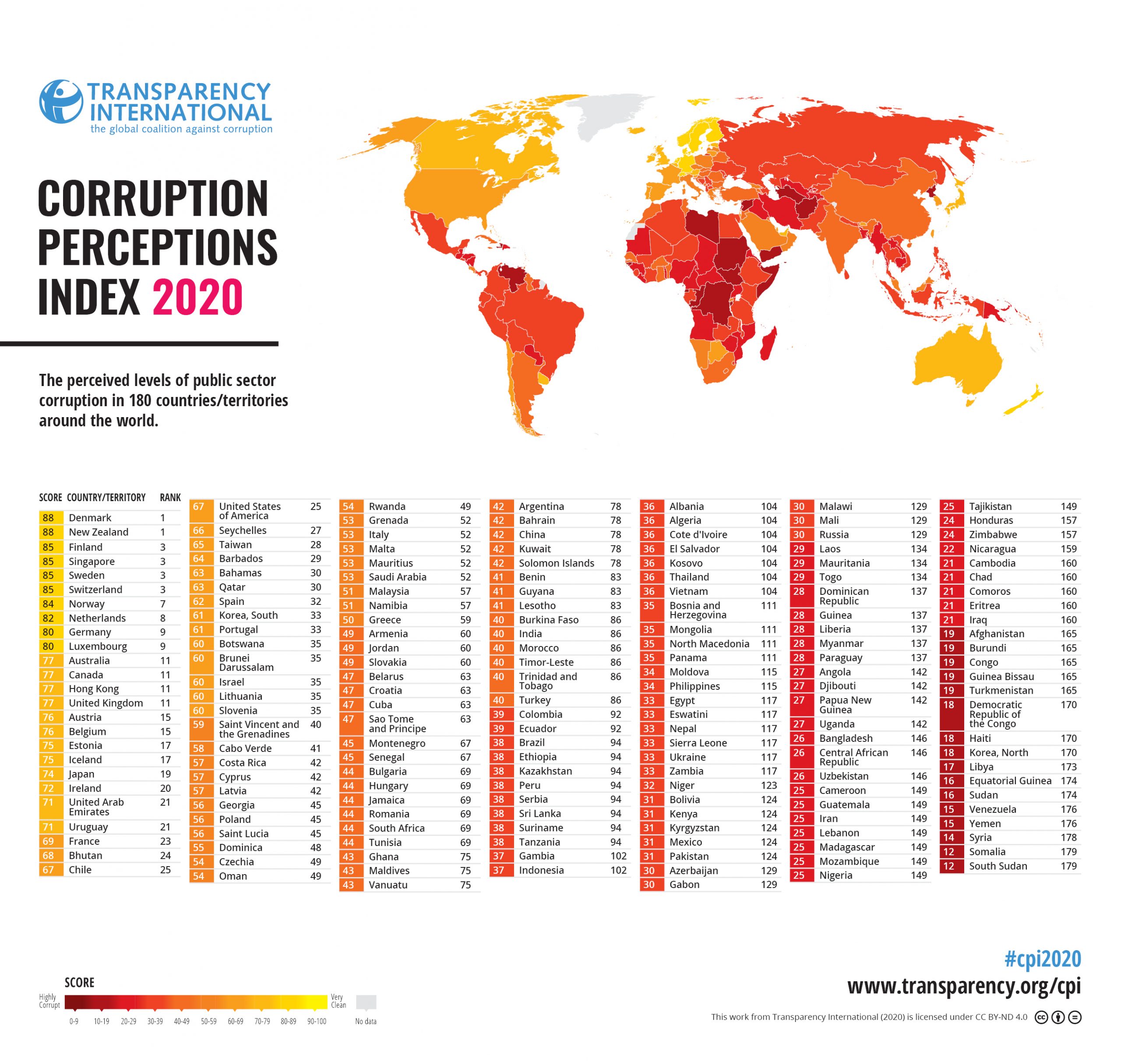 Na szczycie Indeksu Percepcji Korupcji ponownie znalazły się Dania i Nowa Zelandia z 88 punktami. Za nimi są Finlandia, Singapur, Szwecja i Szwajcaria, które otrzymały 85 punktów. Wysokie noty w Indeksie nie oznaczają, że kraje te nie mierzą się z wyzwaniami, takimi jak brak przejrzystości wydatków związanych z walką z epidemią. Autorzy raportu zauważają jednak, że kraje, które osiągają dobre wyniki w indeksie, więcej inwestują w opiekę zdrowotną, skuteczniej zapewniają powszechną opiekę zdrowotną i rzadziej naruszają demokratyczne normy lub rządy prawa. Ostatnie miejsca, podobnie jak w ubiegłym roku, zajmują Południowy Sudan, Somalia (12 punktów) i Syria (14 punktów).
