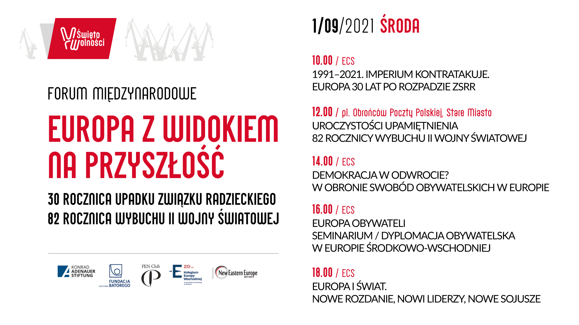 W czasie Święta Wolności w Gdańsku zapraszamy na Międzynarodowe forum „Europa z widokiem na przyszłość”, a w nim szczególnie gorąco na seminarium: Dyplomacja obywatelska w Europie Środkowo-Wschodniej, które odbędzie się 1 września 2021 w godz. 16.00-18.00 na sali wystaw czasowych Europejskiego Centrum Solidarności. Wydarzenie transmitowane na profilu ECS.